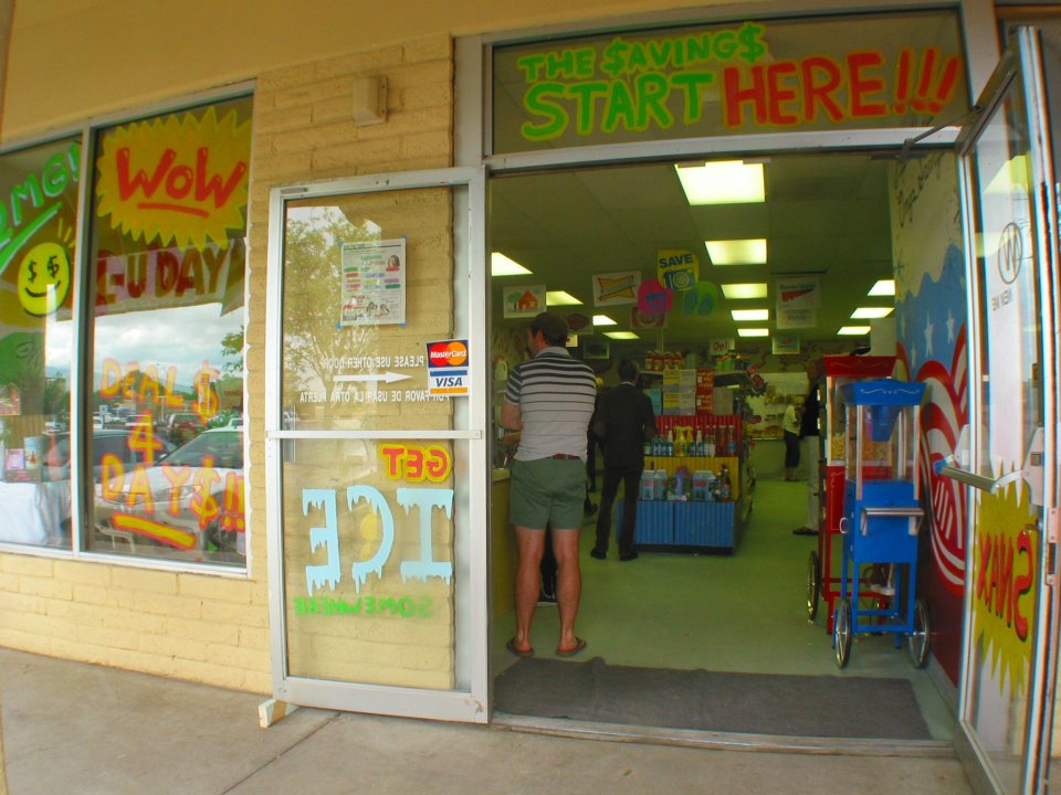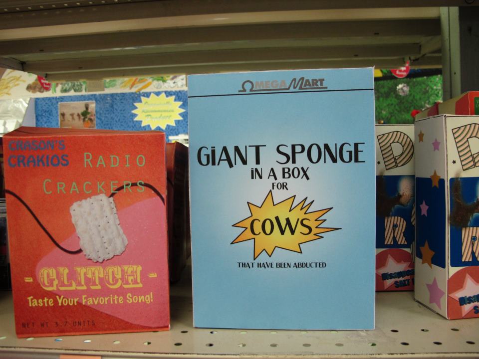 Some products are simply empty boxes or recycled containers with originally designed sticker-labels. Other products are cast-plaster sculptures painted and labeled with repetitive consistency. OmegaMart also stocks with finest oxymorons like ‘Locally-Nationalized Produce’ and ‘Organically Recommended Meats.’ Tongue-in-cheek murals surround shoppers, and fake handmade display cases and freezers line the walls. Many collected items from actual grocery stores - ‘Sale!’ and ‘ Big Savings!’ signs - hang from the ceiling alongside humorous propaganda posters.